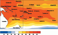 Southwest Pacific mean sea-level pressures tended below average over much of the tropical Pacific about and east of Vanuatu, the largest negative anomalies being south of the Cook Islands. Equatorial surface easterlies continued to be very persistent along the Equator, occurring in about 99% of observations at Tarawa.