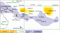 Suppressed convection with below average rainfall was expected over Western Kiribati and Tuvalu, with near or below average rainfall in Eastern Kiribati and Tokelau. Regions of near or above average rainfall were expected from Papua New Guinea southeast to Pitcairn Island including Vanuatu, Wallis and Futuna, Tonga, Niue, the Southern Cook Islands, and the Austral Islands. Near average rainfall was expected elsewhere.