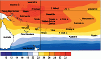 Tropical Southwest Pacific mean sea-level pressures were above average over much of Australia, the Tasman Sea, and well east of New Zealand, along latitude 35° S. They were below average in tropical areas near the equator east of the Date Line.