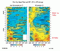 During early September 2005, negative SST anomalies began to develop off the west coast of South America and extended west. A high pressure anomaly centered over northern Argentina and Chile led to strong southeast trades and cross-equatorial flow, and increased coastal and equatorial upwelling. Larger-scale easterly wind anomalies subsequently developed along the equator in middle to late November in response to the anomalous east-to-west SST anomaly gradient. In December the spatial extent became suffi cient to impact the Nino3 and then even the Nino3.4 SST anomalies, leading to a more basin-wide coupling with the atmosphere. La Niña SST conditions became established by early December, and continued for three to four months. There were no obvious precursors to the event from 100°W westward (Fig. 1), as the winds and SSTs began their cold phase behavior approximately concurrently, and eased back to neutral in much the same way nearly four months later.