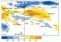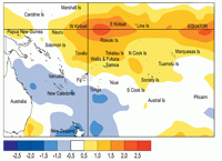 Tropical Southwest Pacifi c mean sea-level pressures were above average over the southern half of Australia, extending northeast to Southern Tonga. Pressures tended to be below average in equatorial areas east of the Date Line.
