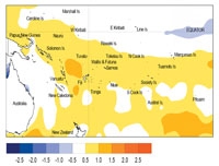 Tropical Southwest Pacific mean sea-level pressures were above average over Australia, and generally below average in the equatorial Southwest Pacific from Papua New Guinea to the region east of the Date Line as well as in the Tasman Sea (due to frequent cyclogenesis there).