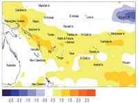 Tropical Southwest Pacific mean sea-level pressures were below average near 5°S of the Equator about and east of the Date Line, with high pressures south of 25°S in the eastern South Pacific.