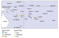 Suppressed convection and below average rainfall occurred as expected in the equatorial region about and east of the Date Line, including Western and Eastern Kiribati. Rainfall was also below average (as expected) in Tonga and the Society Islands (drier than expected). Rainfall was above average as expected in Vanuatu and the Tuamotu Islands. The ‘hit rate’ for the June-August 2007 rainfall outlook was about 70%.