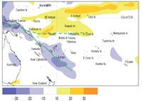 Tropical OLR anomalies show suppressed convection from west of the Date Line right across the Pacific north of the equator. The TRMM-based ENSO precipitation index has become more negative, and is -0.9, in the weak La Niña range. The SPCZ was very active and displaced south west. The Madden-Julian Oscillation (MJO) is very weak at present.