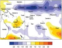 Tropical Southwest Pacific mean sea-level pressures were below average over New Caledonia and a band of the southwest Pacific to the south and west of the SPCZ. Higher than normal pressures occurred across the South Island of New Zealand and extended toward the region southeast of the Cook Islands as well as over all of French Polynesia.