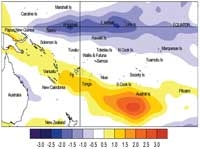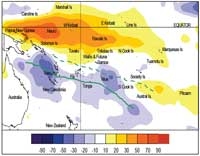 Tropical Southwest Pacific mean sea-level pressures were below average in the north Tasman Sea and to the west of New Caledonia. This pressure pattern produced more northeasterlies with abundant rain into northern New Zealand, and heavy rainfall in New Caledonia and parts of northeastern Australia.