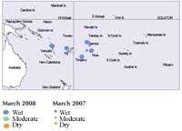 The rainfall outlook for the January– March 2008 period was very similar to what was forecast, the ‘hit’ rate being 68%. Rainfall was lower than expected in northern New Zealand, and Tokelau, and higher than expected in Samoa.