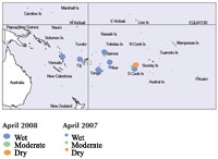 The rainfall outlook for the February – April 2008 period was very similar to what was forecast, the ‘hit’ rate being 68%, 6% higher than average. Rainfall higher than expected in the Solomon Islands and Samoa.