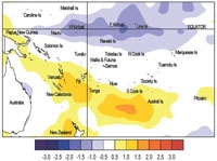 Tropical Southwest Pacific mean sea-level pressures were below average in the north Tasman Sea and to the south of New Caledonia. This pressure pattern produced more north easterlies with abundant rain into northern New Zealand, and heavy rainfall in New Caledonia and the Solomon Islands.