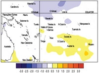 The near-Equatorial trade winds are slightly enhanced in the central equatorial Pacific and near normal elsewhere. Convection was largely suppressed along the equatorial regions from the eastern Pacific through to Indonesia. The SPCZ was active from near Fiji towards the Southern Cook Islands. The Southern Oscillation Index (SOI), also shifted to a slightly positive value in June, and is +0.4 (3-month mean +0.1). The TRMM ENSO precipitation index was around –1.2 at the end of June (weakening from a strong La Niña value of –2 in April). The Madden - Julien Oscillation is very weak at present.