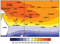 The South Pacific Convergence Zone (SPCZ) exhibited diminished activity in July relative to previous months. Only a small region of enhanced rainfall was observed in satellite data during July 2008, centred near Papua New Guinea and the Solomon Islands. A region of suppressed convection expanded along the Equator relative to last month, and extends from Western Kiribati to Eastern Kiribati including Tuvalu, Tokelau, and the Northern Cook Islands. The regional circulation was characterised by more frequent anticyclones to the northeast of New Zealand and lows to the southwest of Pitcairn Island.