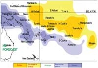 During the December 2008–February 2009 forecast period, a region of suppressed convection is likely to encompass the central and eastern Southwest Pacific, in a region extending from Western Kiribati to the Marquesas Islands, including Tuvalu, Tokelau, Wallis & Futuna, Samoa, the Northern Cook Islands, and the Tuamotu archipelago. Below normal rainfall is expected for those countries. Near–to–below normal rainfall is expected for the Society Islands, Pitcairn Island, and Eastern Kiribati.