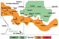 SSTs are expected to be near–to–above normal in a band extending from near Papua New Guinea, southeast to Fiji, including Vanuatu, New Caledonia, the Solomon Islands, Niue, the Southern Cook Islands, the Austral Islands, and Pitcairn Island. Normal to below normal SSTs are forecast for the northeastern sector of French Polynesia, including the Tuamotu archipelago and the Society Islands, Tuvalu, Tokelau, and Eastern Kiribati. Western Kiribati is projected for normal SSTs during this time.