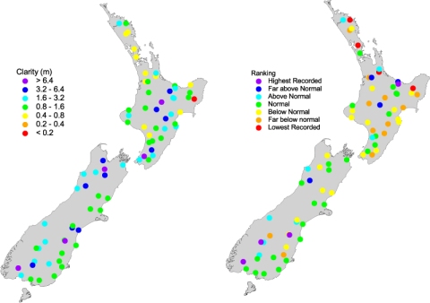 Water clarity - rivers were, as is typical, generally clearer in the South Island than the North Island. Visual clarity was high in some southern South Island rivers (consistent with low river flows there), and unusually low in some North Island rivers. (Water clarity is measured by black disc visibility.)