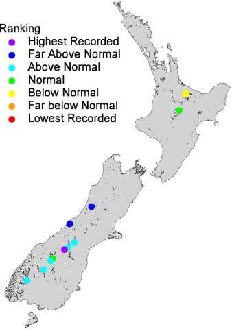 River flows over the winter were below normal in the south and west of the North Island, and also in most of Southland. Above normal flows occurred in Gisborne, Hawkes Bay and the southwest of the South Island. Flows elsewhere were near normal.