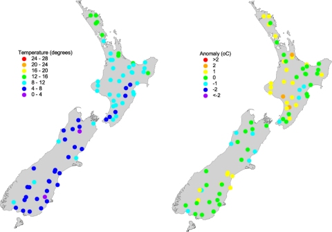 River water temperatures were near normal over most of the country, although slightly higher than normal in the centre and west of the North Island. There was a clear north-south gradient in river water temperatures.