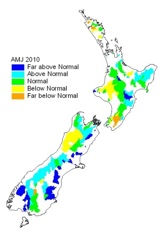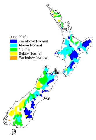 Flows over the last three months (April to June 2010) ranged from above normal on the east coast and in the north, central, southwest and east of the South Island, to well below normal in parts of Northland and the Waiarapa.