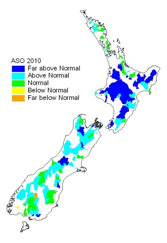 Flows over the last three months (August to October 2010) ranged from well above normal in the central North Island, and above normal over most of the South Island, to normal in parts of Northland, Bay of Plenty, and Southland.