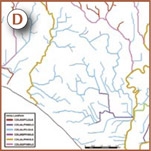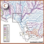 River Environment Classification for stream channels in an area of 125 km2 just northwest of Invercargill (A). Small coastal streams draining low-lying swampy areas (blue and purple) are distinguished from larger streams that drain larger areas of other landscapes. The classifications are derived from the other three maps at larger scales showing: climate zone (A ); source of flow (B); geology (C & D). [Graphics: Mark Weatherhead]