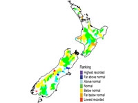 Summer river flows were relatively high in western Taranaki, some parts of the central North Island, and the Canterbury foothills. Unusually low summer river flows occurred in Auckland, eastern Taranaki, and central Hawke’s Bay. Record low summer flows occurred in two western South Island catchments.