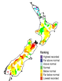 River flows were well above normal in Northland, mainly as a result of the severe flood events in April. Some central North Island catchments had normal river flows for this time of year, but flows were below normal for the rest of the country. Record low flows occurred for some rivers in Marlborough, the Southern Alps, and Southland.