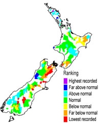 River flows over the last 3 months were below normal for South Island east coast, Wellington and North Island East Cape. Northland, Hawke’s Bay and southwest South Island had above normal flows. Flows elsewhere were normal.