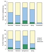 For the invertebrates, community composition was clearly different across habitat types. Groundwater habitats had a very distinctive fauna, with low numbers of a few specialist subterranean taxa (see “Lightless, not lifeless”). The main river and side braids shared very similar faunas. Mayflies, worms and midge larvae dominated and only 15 of the 114 taxa were exclusive to these river habitats. Springs and the spring streams they fed contained the most diverse invertebrate fauna, and 45 of the taxa we found were restricted to these habitats (see graph).