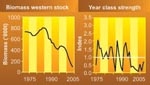 Fisheries managers and fishers are concerned about the recent decline in the western stock of hoki. Fish biomass is expected to decline to a level estimated to be around a size that will generate maximum sustainable yield (about 20% of the initial biomass). The most recent stock assessment estimates that the western stock is now at about 13% of the biomass that existed before fishing began (left panel); this is cause for concern and will lead to large cuts in the Total Allowable Catch. Year class strength (YCS) is the relative abundance of hoki spawned in a particular year. Of most concern is the below-average YCS since 1995 (right panel). The horizontal line represents average YCS.