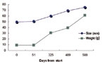The system is designed to initially contain three species, and has been set to run at optimal growing conditions for paua, based on an initial stocking size of 20–30 mm: flowing water at 18–20 °C, and pH 7.8–8.2. The paua are fed an artificial diet, occasionally supplemented with seaweed, and are kept in a darkened room, as they actively feed at night. In our pilot system, which is stocked with 125 kg of paua, growth and weight increased exponentially over time, with growth rates ranging from 50 to 100 μm per day (depending on variables such as stocking density and temperature).