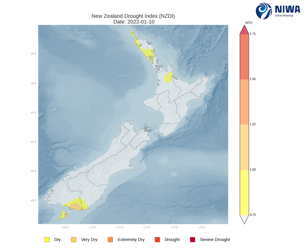Hotspots are currently located in Nelson and eastern Tasman, along with parts of southern Otago and coastal Southland. The New Zealand Drought Index (NZDI) map below shows that dry conditions are now located in southern Otago, eastern Southland, and Stewart Island. In addition, very dry conditions are located in parts of eastern Southland and Stewart Island as of 10 January.