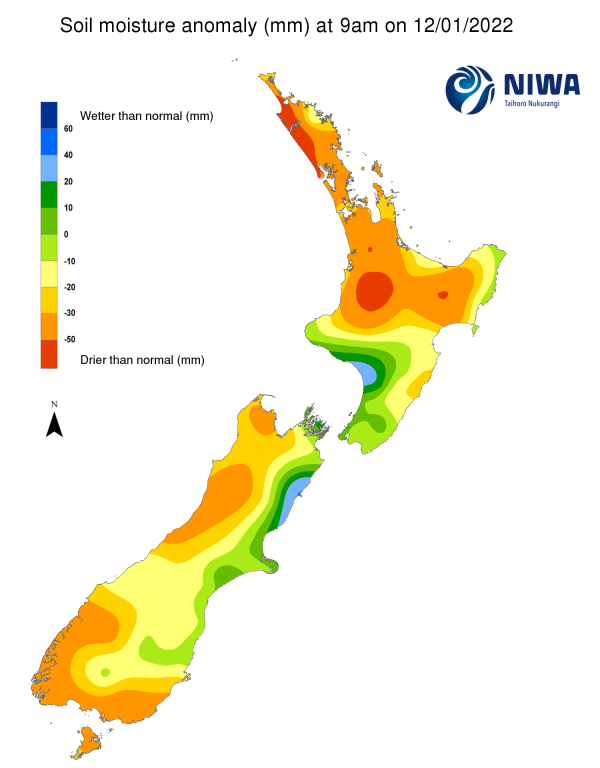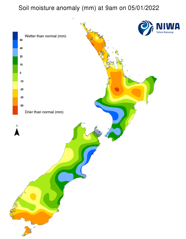 As of 10 January, the New Zealand Drought Index (NZDI) map below shows that dry conditions are now located in much of Northland, northern Auckland, northern Waikato, southern Otago, eastern Southland, and Stewart Island. In addition, very dry conditions are located in parts of eastern Southland and Stewart Island. Please note: some hotspots in the text above may not correspond with the NZDI map. This difference exists because the NZDI uses additional dryness indices, including one which integrates the rainfall deficit over the past 60 days. Changes are therefore slower to appear in the NZDI compared to soil moisture anomaly maps that are instantaneously updated.