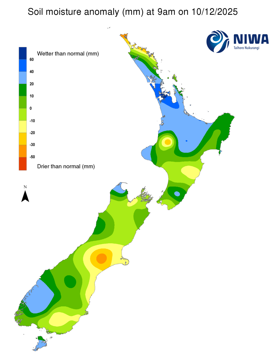 - The drier (25th percentile) scenario shows normal to below normal rainfall across most of the South Island except in Canterbury, and the majority of the North Island, with very dry conditions in the Far North, east of the North, and the top of the South.