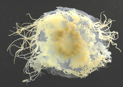 Moon jellyfish (Aurelia sp.) have a bell-shaped whitish body, about 25-40cm across, and have a fringe of short tentacles around the margin of the bell. Lion’s mane (Cyanea rosea) is New Zealand’s biggest species of jellyfish, growing up to an impressive two and a half metres in diameter and with tentacles of up to 36 metres in length. Spotted Jellyfish (Desmonema gaudichaudi) are dome-shaped with reddish-brown polka dots on the body.