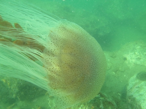 - The lion’s mane (Cyanea rosea) – the biggest jellyfish species seen in our waters with a bell that can reach two metres in diameter and tentacles that can grow up to 36 metres long. It is a pinky brown colour at the top of its bell and creamy to whitish at its margin, and has four frilly oral arms, eight clusters of tentacles and each cluster has more than 100 individual tentacles. They occasionally swarm in large numbers and deliver a painful sting.