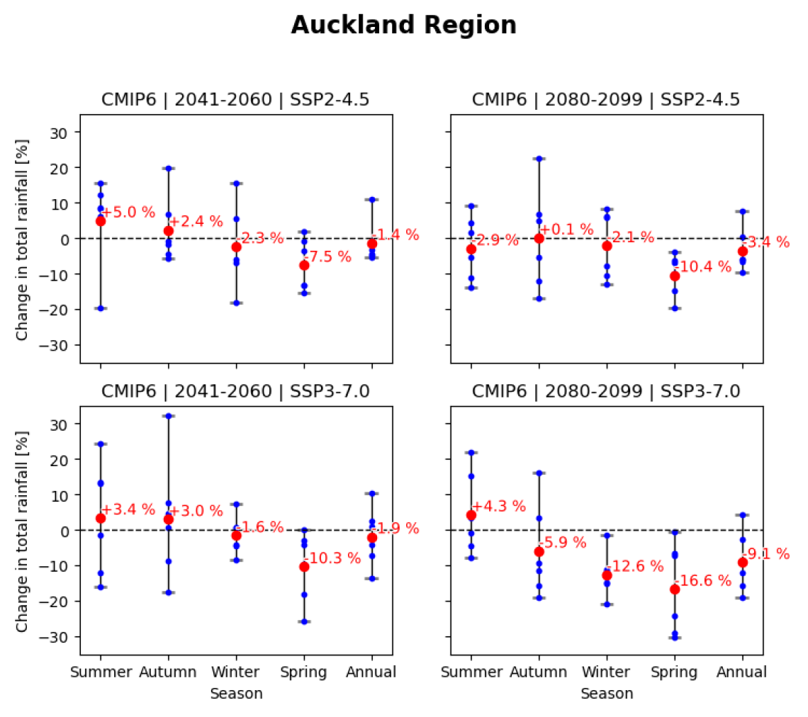 It is important to note that model errors in the historical period do not necessarily translate to expected errors in the future projections. Instead, a better way to assess future projection uncertainty is to look at the range of model outcomes (i.e. across the six downscaled models) for a given variable or season. For example, Figure 1 below shows the spread of projected changes in precipitation for Auckland – note that some models predict increasing precipitation (i.e. change greater than 0) and some models predicting decreasing precipitation (i.e. change less than 0). These changes and associated uncertainty can also vary across seasons.