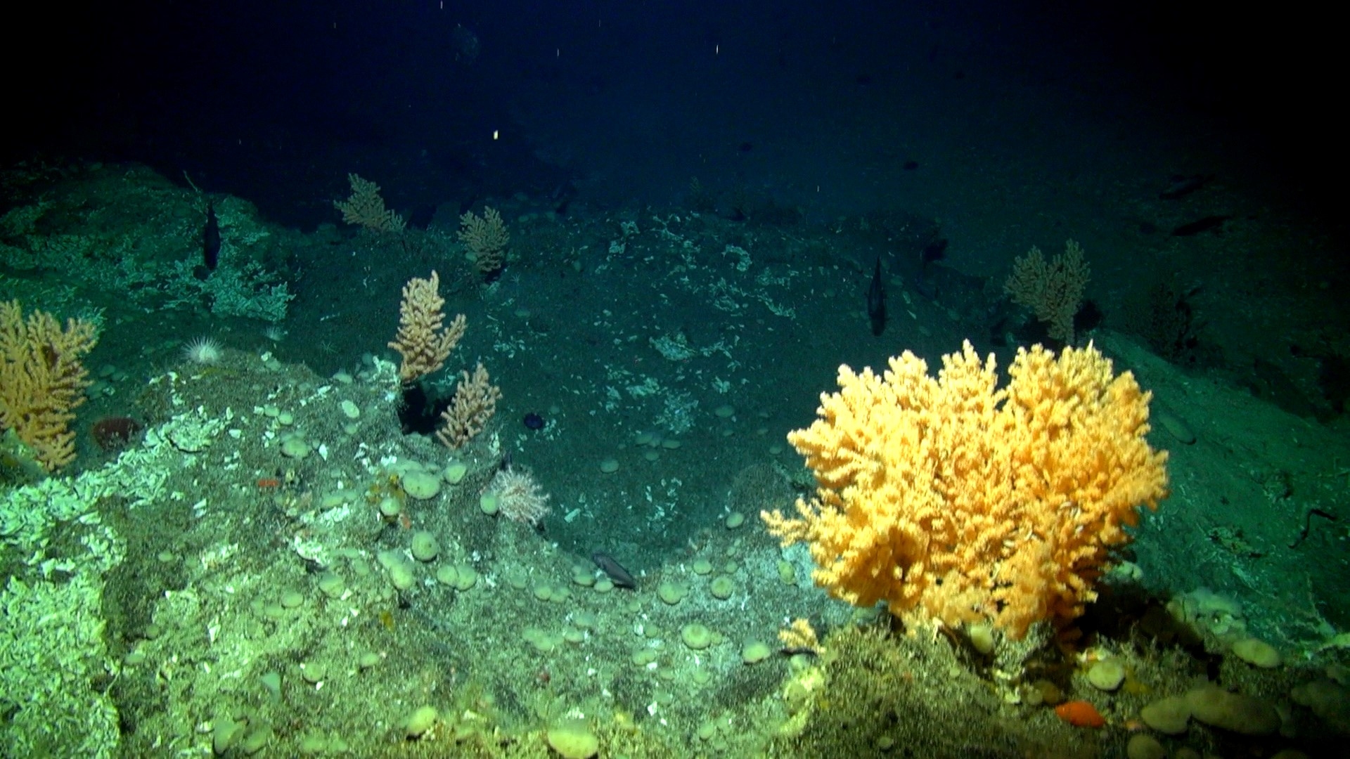 But if Seamount 5 was impressive, we were in for a shock when we headed to Seamount 4. As Co-lead Alex Rogers put it, “Filming on Seamount 4 by DTIS was quite remarkable. This was an isolated and small feature <200m in elevation. However, the seamount proved to be a rugged outcropping of bedrock with abundant black oreo (Allocytus niger), occasional orange roughy and other fish and shark species. The seamount substratum also consisted of coral rubble, but rock faces were colonised by dense populations of yellow sponges and in places large orange colonies of primnoid corals were also visible.”