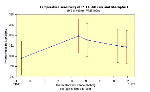 PTFE is an excellent diffuser material for instruments exposed to the elements: It has a low coefficient of thermal expansion (0.000122mm per degree Celcius) It has a low moisture absorption (< 0.01%) It is stable against damage by UV radiation The following graph shows the measured temperature-sensitivity of teflon for the temperature range 19 degrees Celcius and 45 degrees Celcius.