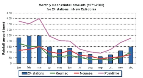 There are two main seasons, the wet season (December to March) and the dry season (mid July to November) (Figure 2). During the wet season, rainfall tends to be higher in the northern part of the main island. For example, at Nouméa, the monthly rainfall is lower than that recorded at Koumac for January and February but higher from April to August for a very similar annual amount. There are also large differences in rainfall amounts between the two coasts such as between Poindimié located on the east coast of the main island and stations located on the west coast (Koumac and Nouméa).The average temperature is about 23°C with an annual variation of 6°C to 8°C between the warm and cool season. Minimum temperatures can sometimes be very low in some places: overnight temperatures below 10°C are not unusual inland and the extreme minimum is 2.3°C. The extreme maximum temperature ever recorded is 38.8°C at Poya. The diurnal temperature range is very dependent on the location: areas closer to the sea have a smaller diurnal temperature range.