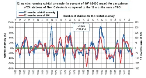 The El Niño Southern Oscillation (ENSO) also plays an important role on rainfall and cyclone activity. For the geographical domain around the archipelago (18°S to 24°S and 162°E to 170°E), research shows that there is usually increased cyclonic activity (+32%) during La Niña events whereas there are usually the normal frequencies of tropical cyclones during the El Niño events. El Niño episodes tend to reduce rainfall, which sometimes causes severe droughts especially on the west coast. Above average rainfall is usually experienced during La Niña events, which impact on agriculture and mining (Figure 1).
