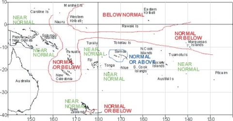 Average or above average rainfall is expected in Samoa. However, a large area of suppressed convection in the equatorial region should extend south, to affect areas west of the Date Line, with below average rainfall likely in Western and Eastern Kiribati, and average or below average rainfall in New Caledonia, and Vanuatu, as well as the Marquesas Islands. Average rainfall is expected elsewhere in the region. The model skill is moderate to low for this time of the year.