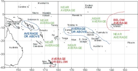 Enhanced convection is expected in parts of the tropical Southwest Pacific resulting in average or above average rainfall from the Solomon Islands trending east to the Austral Islands, including Samoa, the Northern Cook Islands and the Society and Austral Islands.