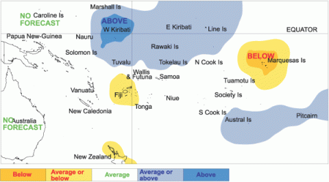 Enhanced convection is expected over the equatorial Pacific region, where rainfall is forecast to be above average for Western Kiribati. Enhanced convection with average or above average rainfall is over Eastern Kiribati, Tokelau and Tuvalu, as well as the Austral Islands and Pitcairn Island.