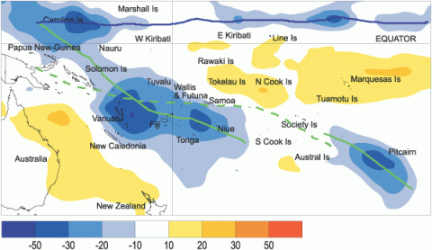 Mean air temperatures were at least 0.5 °C above average in Fiji, Samoa, and Tonga, as well as Northern and Central French Polynesia. Temperatures were at least 0.5 °C below average in parts of New Caledonia and Southern French Polynesia.