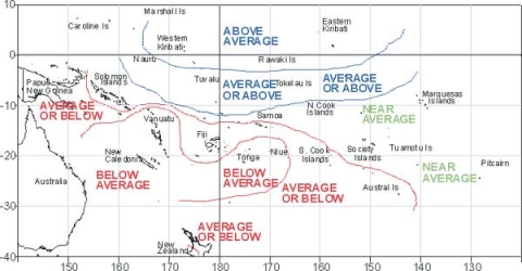Below average or average rainfall is expected from Fiji to the Austral Islands, including Samoa and Southern Cook Islands. Below average rainfall is expected for Vanuatu, New Caledonia, Tonga and Niue. Near average rainfall is more likely elsewhere.