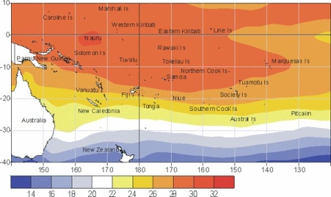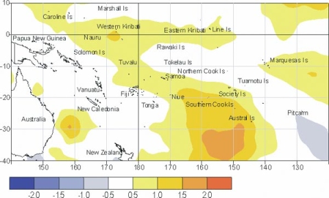 The tropical Pacific remains in a near neutral state with mixed warming and cooling signals and a fluctuating SOI over the past few months. June SSTs were about 0.5°C above normal in the equatorial Pacific around Western and Eastern Kiribati.