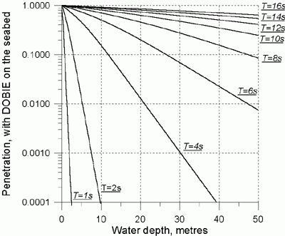 The figure shows how penetration varies with wave period (T) and water depth. As a rule of thumb, sensor noise will begin to mask the real signal when penetration gets as low as 0.01 to 0.05.