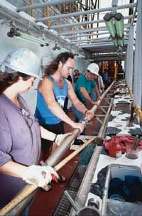 The sediment in this deep ocean core, recovered during the Ocean Drilling Program, represents material accumulated over many thousands of years, including organic and inorganic remains that can provide clues to ocean environmental conditions long ago. (Photo: courtesy of the Ocean Drilling Program)