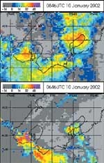 The convergence line, visible in the radar imagery, could not be discerned in satellite imagery, or in larger-scale weather models. We are trying to see whether more detailed modelling of the event could have resolved the conver-gence and predicted the downpour.