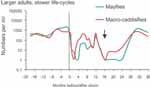 The picture was different for invertebrates with winged adult stages. Species with small mobile adults and rapid life-cycles (weeks to months), such as midges, had moved back into pasture stream in large numbers within two weeks of the flood. Larvae of a small caddisfly, Oxyethira albiceps, also quickly became very abundant. This micro-caddisfly proliferates in filamentous algae, which started growing shortly after the high flows subsided. These animals went through several “boom and bust” cycles of population growth and decline.